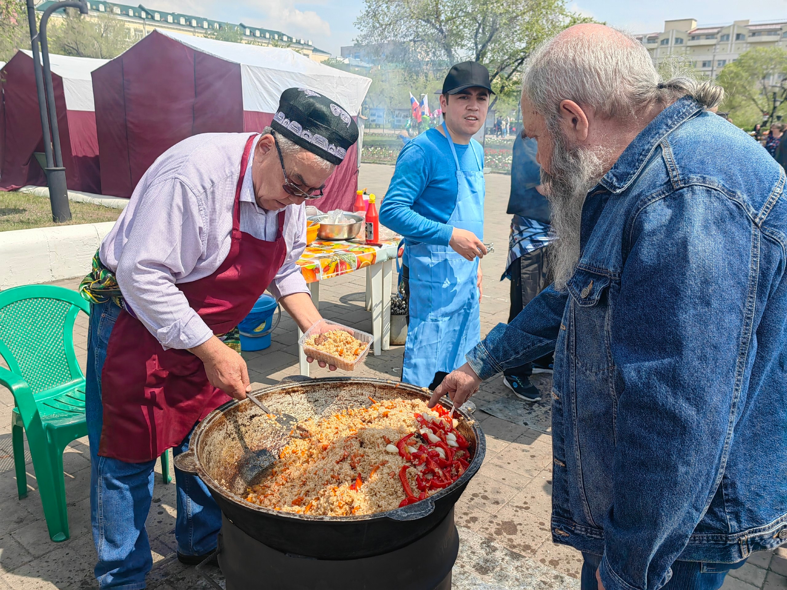 На площади уже много зрителей, которые с интересом знакомятся с эксклюзивным искусством мастеров прикладного творчества, и пробуют щедрые угощения национальных кухонь.